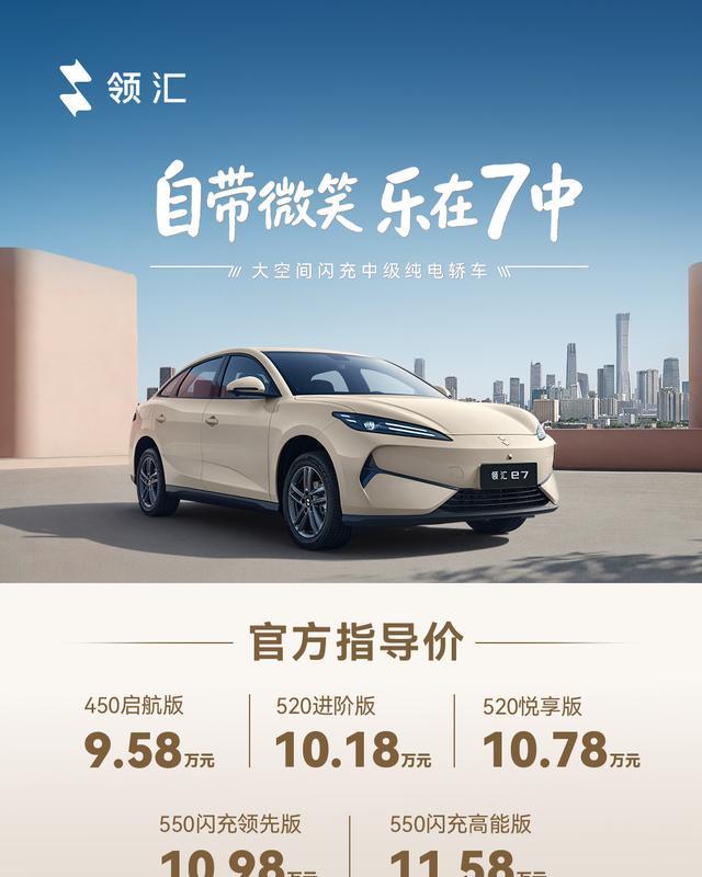 动力方面,搭载纯电动力系统,可选100kW和130kW两种电机功率,CLTC续航里程在450-500km。领汇e7闪充版搭载比亚迪第二代刀片电池及闪充技术,带来“5分钟充好、9分钟充饱、零下30℃只多3分钟”的极速补能体验——电量从10%充到70%,只用5分钟;从10%充到97%,只用9分钟;零下30℃极寒环境下,充电也只比常温多3分钟。